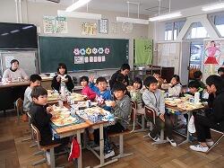 6年生が5グループに分かれ、今週1週間かけて、順番に1~5年生の教室を訪問し、在校生と一緒に楽しく給食を食べるというものです。