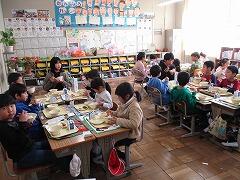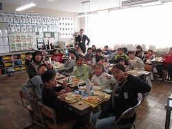 6年生が5グループに分かれ、今週1週間かけて、順番に1~5年生の教室を訪問し、在校生と一緒に楽しく給食を食べるというものです。