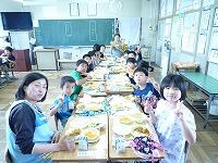 4時間目が終わると、今日は給食セットを持って、なかよし班の教室へ行って、班ごとに会食です。1年生を迎えに行く6年生、配膳をする5・6年生、先生を呼びに行く4年生、ごみの片付けをする3年生、「いただきます」「ごちそうさま」のあいさつをする2年生。それぞれの学年の役割を、責任をもって果たし、楽しい時間になりました。