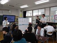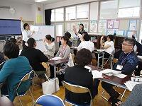 私たち教員が、子ども役になり、グループで楽しく活動をしながら、授業の進め方や、教材の扱い方などを学びました。