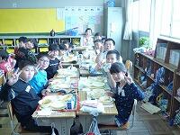 4時間目が終わると、今日は給食セットを持って、なかよし班の教室へ行って、班ごとに会食です。1年生を迎えに行く6年生、配膳をする5・6年生、先生を呼びに行く4年生、ごみの片付けをする3年生、「いただきます」「ごちそうさま」のあいさつをする2年生。それぞれの学年の役割を、責任をもって果たし、楽しい時間になりました。