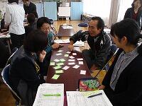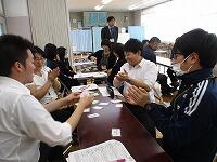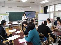 私たち教員が、子ども役になり、グループで楽しく活動をしながら、授業の進め方や、教材の扱い方などを学びました。