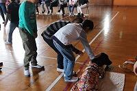 次にアイマスクをつけて、盲導犬と共に歩く体験をしました。学級の代表の10名が体験しました。