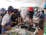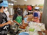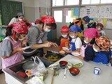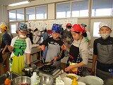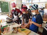 今回は、グループでメニューを考え、材料も分担して持ち寄って作りました。「ゆでて→いためる」「ゆでて→焼く」「いためて→にる」などの2段階の調理をすることを課題としました。