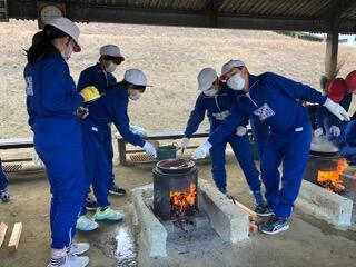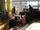 重い荷物をバスから下ろして、帰校式をしました。海風とは違いますが、夕暮れの冷たい風の中、しっかり話を聴く子どもたち…