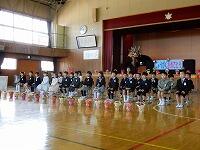 ▼代表児童に、たくさんの雑巾を受け取ってもらいました。