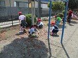 ▼きれいな桜の花が散り、葉桜になって、木の下には花びらなどがたくさん・・・それを、庭掃除の担当班の人たちが、熊手を使って集めています。