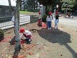 ▼校庭南のツバキの花が散っているので、拾い集めています。