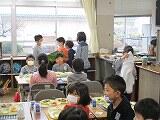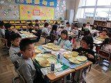 「西方小の給食は、どうですか?」「おいし~い!!」と、にこにこしながら食べていました。
