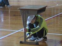 ▼机の下にもぐり、頭を守って、机の足をしっかり押さえています。