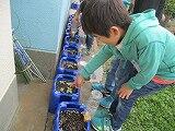 「芽が出たよ~!!」「私のは、かわいい赤ちゃんの芽だよ。」「なんか、葉っぱがくっついてるよ。」「ぼくの、見て~!黒いのは、種の帽子みたい・・・」などと、友達や先生に気付きを伝えています。