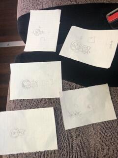 バスの中ではレク係によるレクリエーションが行われています。お絵かきゲームのお題は「ドラえもん」思い思いのドラえもんを描いています。みんなバス酔いの症状もなく、順調です(^^)