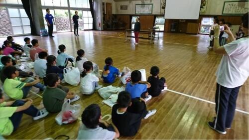 4年生が、今日から2日間、太平少年自然の家で宿泊学習です。心配していた雨も降らずに出発式を行いました。欠席もなく、43名全員で、元気に出発しました。
