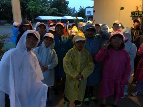 小雨なので、子どもたちが楽しみにしていた「ナイトハイキング」に出かけることになりました。雨よけのために、色とりどりのカッパを着て、外に集まりました。