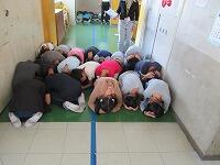 できるだけ窓のないところで、身を低くして頭を守る「だんご虫」のポーズをとりました。狭いところでもがまんして、自分の身を守る方法を学習しました。