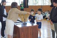 次に、空手の大会で優秀な成績を収めた7名の児童に表彰伝達をしました。みなさん優勝や準優勝、第3位になり表彰を受けたものです。賞状とトロフィが渡されました。