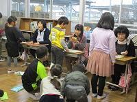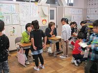 まず、3年2組の教室で、「カードめくり」「フラフープくぐり」「仲間集めゲーム」など、さまざまなゲームをしました。3時間目は、3年1組と合同で音楽の授業を行いました。リコーダーやハンドベル、トライアングルなどで「ジングルベル」の合奏をしました。