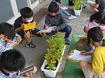 今日は雨でしたが、昇降口のところで観察をしました。以前と比べて草丈が髙くなり、葉の枚数が増えたことをみんなで確認しました。ほかにも茎の色や葉の形など、詳しく観察することができました。