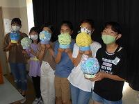 6年生の図工の学習で「ランプシェード」づくりを行っています。風船を膨らまし、その周りに色をつけた紙粘土を巻き、丸い型を作りました。それぞれの思いで、色を工夫しました。完成したら、中にランプを置き、色の変化を楽しみました。