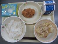 この日の給食は、ごはん、牛乳、ハンバーグおろしソース、ジャーマンポテトサラダ、モチクリームアイスでした。