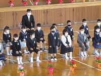 本年度西方小学校の新入生は30名です。担任の先生の呼名に対して元気よく返事をして立ちました。校長先生から全員の入学を認められました。その後、校長先生からの式辞がありました。新入生はとても真剣な態度で聞いていました。校歌斉唱は6年生児童と職員で行いました。