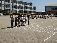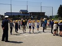 金崎駐在さん、交通指導員のお二人をお招きして、校庭に模擬道路をかいて横断のしかたなど、ご指導をいただきました。