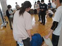 養護教諭からアクションカードに関すること、エピペンに関すること、消防署への通報のしかたなどの説明を受けた後、緊急時対応シミュレーション訓練を実施しました。