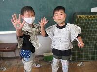 2年生の図工で造形遊び「新聞紙と遊ぼう」を行いました。新聞紙を切って、破いて、貼り付けていろいろな遊びをしました。今回はその中から新聞紙ファッションをご紹介します。