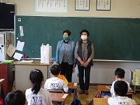 更生保護女性会の2人がお見えになり、1年生に雑巾を寄付してくださいました。