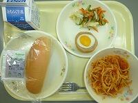今日の給食は、コッペパン(いちごジャム)、ツナのトマトソーススパゲティ、スコッチエッグ、アスパラのサラダです。