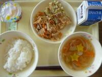 献立は、ご飯、牛乳、五目ご飯の具、ちくわの磯部揚げ、七夕汁、七夕ゼリーです。2年生が農園で育てた「ズッキーニ」は、七夕汁の具材としていただきました。