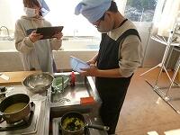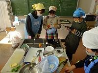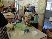 学校栄養士の先生やボランティアの先生にもお手伝いをいただき、調理している児童、タブレットでその様子を記録している児童、作り終わって食べている児童がいる授業形態となっています。