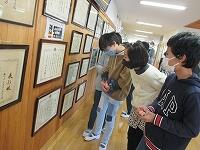 ポスターや書道、持久走大会の新記録、多読賞などの受賞者28名が会議室で校長先生から賞状やトロフィーなどをもらいました。
