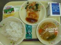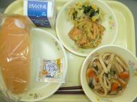 ごはん、牛乳、揚げだし豆腐(京都府)、千草和え(兵庫県)、吉野汁(奈良県)、海苔の佃煮(三重県)、給食週間はちみつゆずゼリーです。
