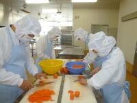 ↑切干大根煮の人参を切っているところです。 ↑スープを配缶しているところです。