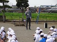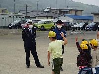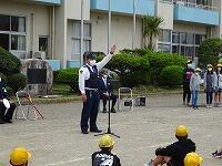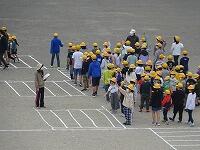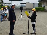 はじめに金崎駐在所の駐在さんから交通安全に関する講話を聞きました。その後、児童たちは通学班ごとに校庭に設置した模擬道路で安全な横断の仕方や道路の歩行の仕方を練習しました。駐在さんや交通指導員さんに練習の様子見ていただき、ご指導をいただきました。6年生の代表の児童が進行やあいさつ等の役割を果たしました。