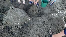 午後の「砂の造形」では、潮汲みリレーから始まり、海に慣れ親しみました。