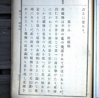 今回は、昔の教科書第2弾として日本歴史の教科書を紹介いたします。この日本歴史は大正元年印刷です。当時は教科書無償化されていませんでしたので、定価八銭と記されています。この教科書は5学年児童が使用していました。今回は鎌倉殿こと源頼朝のページを写真にしました。