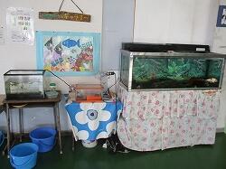 昇降口には、児童が世話をしている生き物がいます。毎日前を通るたびに覗いては、「えさを食べた」「卵が生まれてる」「おしりから○○だぁ」