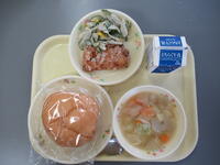 丸パンスライス 牛乳 チキン竜田 ごぼうサラダ 角切り野菜スープ