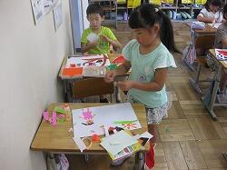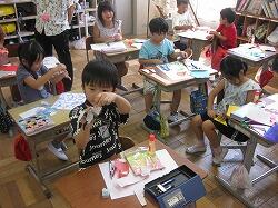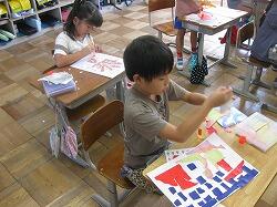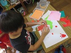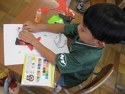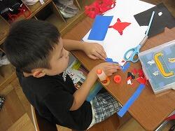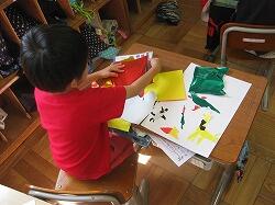 色紙をちぎって画用紙に貼り、絵を描いていました。頭の中には、絵のイメージができていて、それに合わせて紙をちぎるため、指先を器用に動かすのが大変そうでしたよ