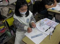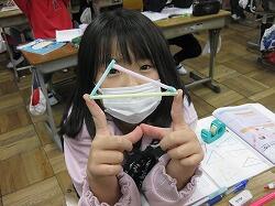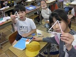 できた三角形は、近くの友達同士で見せ合い、三角形ができているかを確かめました。具体物を作る活動は、楽しそうですね
