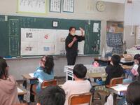 1時間に使ってほしいセンテンスは、ALTの先生と担任との簡単な会話で示し、児童が練習をしてから発話するようにしています。