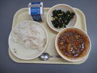 ごはん 牛乳 チキンカレー ベーコンと小松菜の炒め物