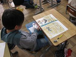 算数では、地図上の道案内を分数で表わしていました。帯分数・仮分数・真分数のまとめでしたが、なかなか難しく、見ている自分もすぐに答えが出せませんでした