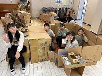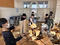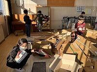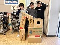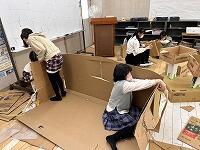 子供たちは朝からやる気満々!給食室や保護者の皆さんに協力していただいて集めた段ボールたちを、協力して会議室に運び込みました。