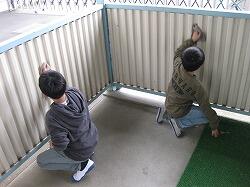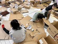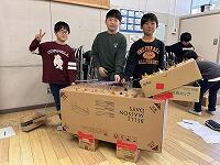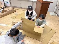 結束バンドで段ボール同士をつなげるのにみんな苦戦しているようです。