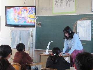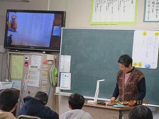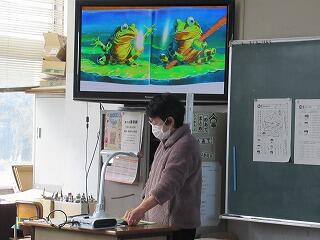1年生は、国語の時間に、「たぬきの糸車」の音読発表をするそうです。そこで、好きな場面を選び、音読で気を付けたいことを確認してから、紙芝居形式で練習をしていました