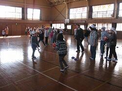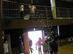 新聞紙を丸めて作った「おにぎり豆」を使って、風邪ひき鬼やなまけ鬼などを退治しましたよ。