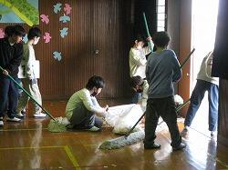 朝の昇降口。廊下の掃き掃除をしている子たち‥‥。